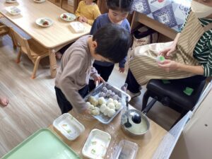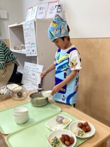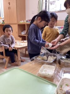 栄養士さんに作ってもらったおにぎりやおかずを順番に詰めていきます。