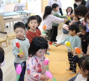 最後は折り紙で折ったチューリップを交換しました。